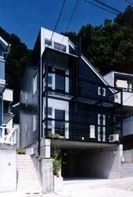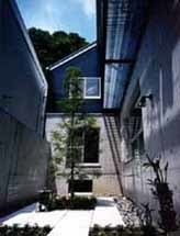 間口が狭く、奥行きが長いうえ、急傾斜地にあるこの住宅は、採光と通風をよくするため中庭を効果的に利用している。