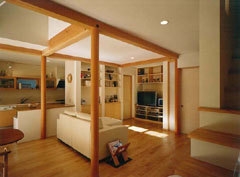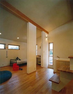 全ての部屋の通り道にもなっているので、構造的に必要な柱を利用してテレビコーナーを明確にしている。