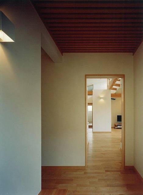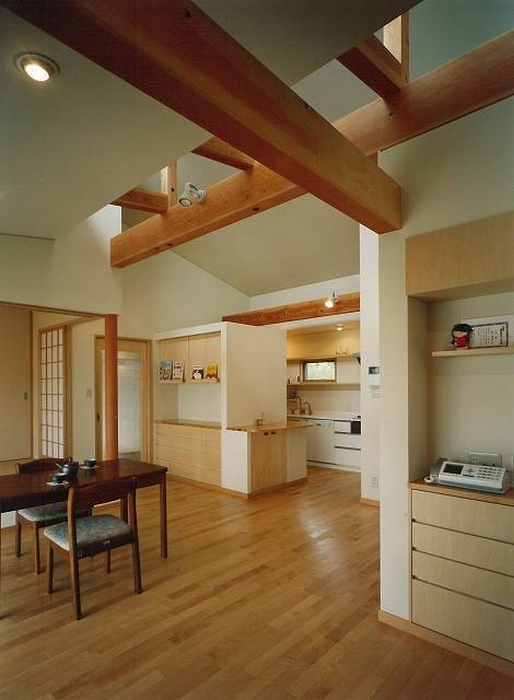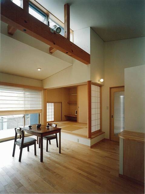リビングを中心にキッチン、水周り、収納と日常的な要素がコンパクトにまとまっている。腰掛けられる高さのタタミコーナーは障子での開閉により多様な使い方が可能。リビング中央部への通風、採光のため高窓やスリットを利用している。