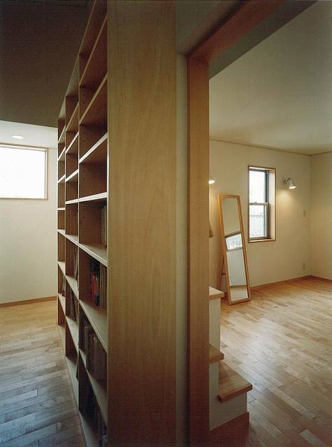 大きな本棚のある廊下。その奥の窓のある部分はとっておきの読書コーナー。