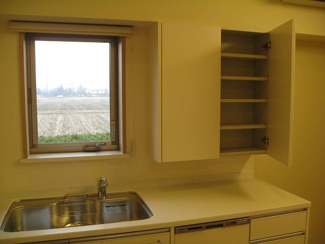 かつての台所は、大きな窓があっても生かされていなかった。窓を小さくしガラスを透明にしたところ、北側正面の田んぼや里山、遠方の雪をかぶった山々が見え、こんなに窓の外の眺望がよかったことにみんなで驚いた。かつての窓の前の雑然とした収納は、少し奥行きの浅い低めの吊戸棚を作り対応した。