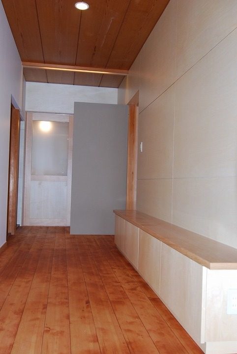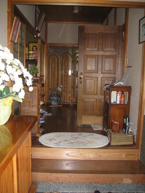 玄関の左は和室に繋がる4枚引違のガラス戸だったが、1枚を残して壁でおおった。右側は応接間への入り口ドアの必要がなくなったので、シナ合板で壁を作り、好きな絵を飾るギャラリー空間にした。