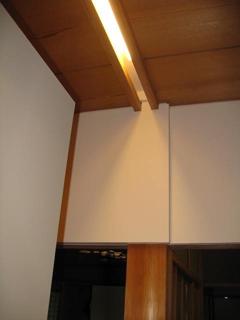 玄関正面の引き戸のための垂れ壁を取ってすっきりさせたが、廻縁が残った。これを利用して隙間に細い蛍光灯を入れ、間接照明風にした。