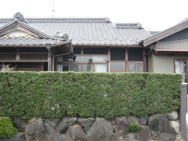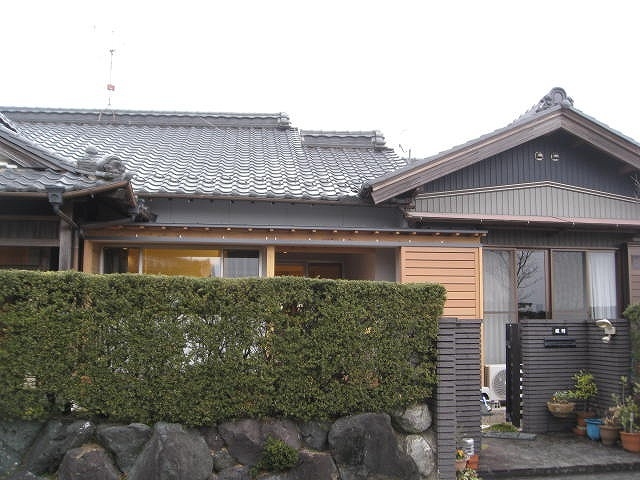 改装前とほぼ同じ位置から見た。玄関右横の応接間と東側に増築した部分の間を思い切ってくりぬき、縁側デッキを差し込んだ。