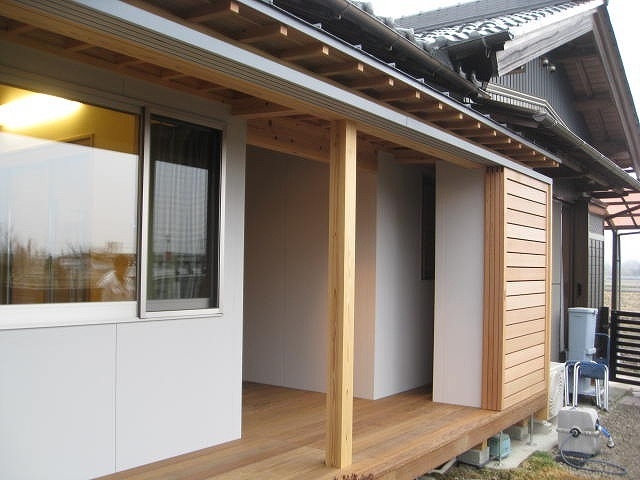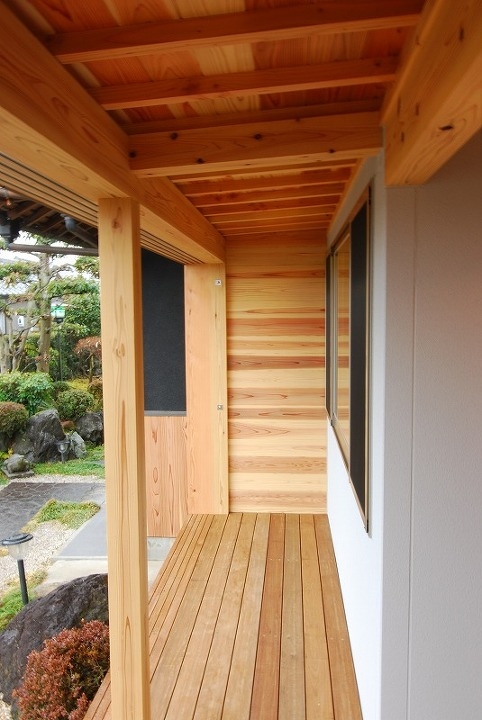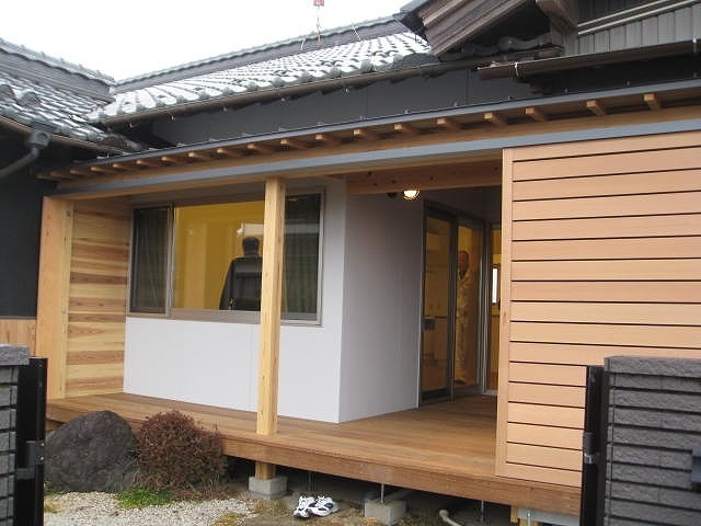 縁側デッキの内部の様子。床面には南洋のデッキ材を使用し、壁、天井は白木の杉板。和室の前にある縁側はあまり活用されていなかったが、この新しい縁側が日向ぼっこができるくつろげる空間になった。