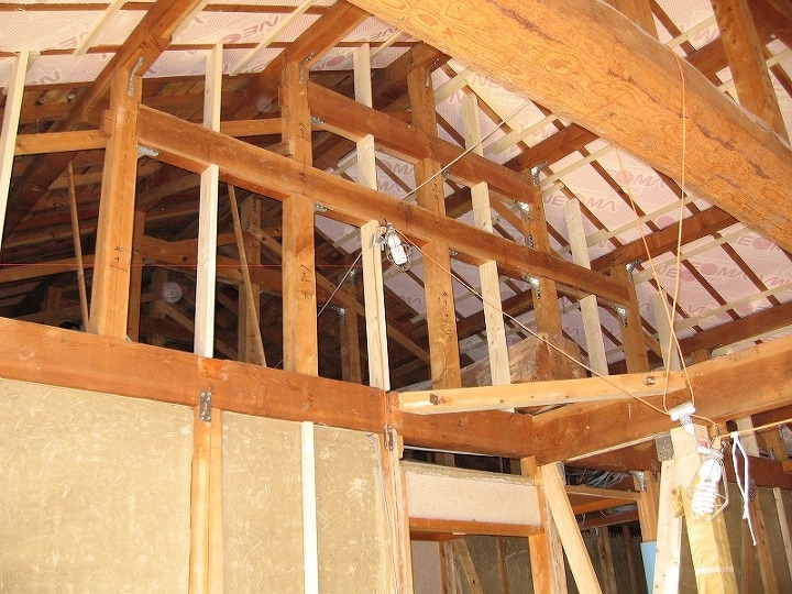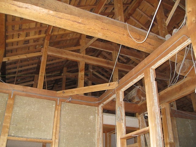 解体してみると立派な松の梁があり、生かそうということになった。屋根でできた三角形の部分は座敷のほうまで続き、断熱材もなかった。ダイニングキッチンと応接間の間の様子、構造に関係のない柱は抜けることを確認した。