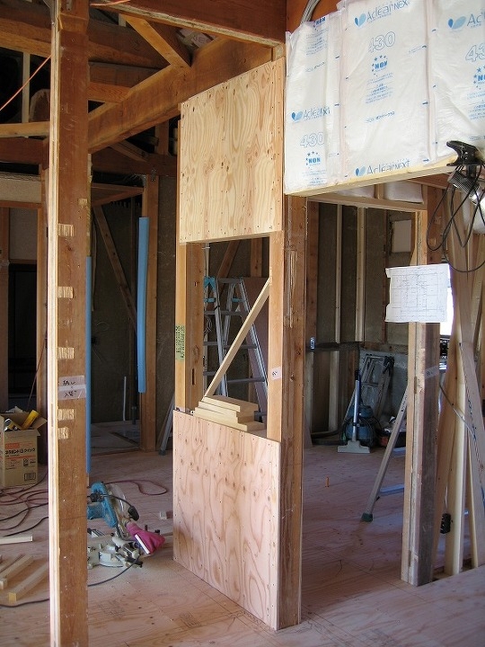 ダイニングキッチンと応接間の間の柱は抜くことが可能であったが、ダイニング側の柱は残さざるを得なかった。開放感を出すために合板で補強し、一部開口部を作った。壁にも断熱材を追加している。