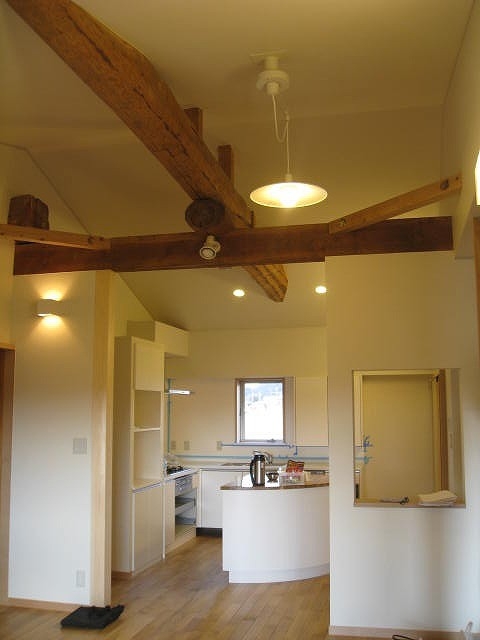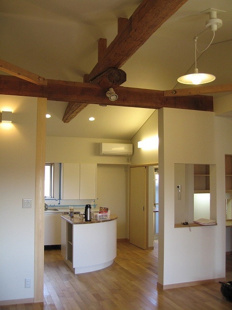 ダイニングキッチンと応接間を繋げ、広々としたキッチンをダイニング側から見る。立派な松の梁が、リフォームならではの存在感で空間を引き締めている。くりぬいた壁が右側に見える。