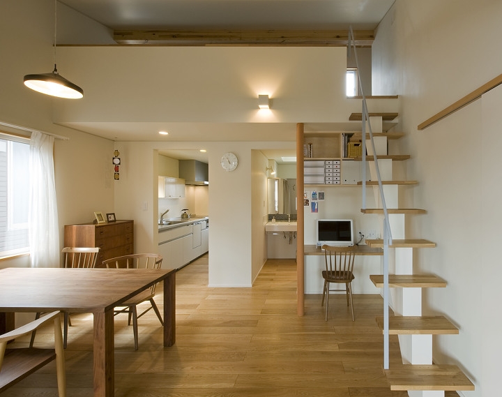階のLDKに隣接して、浴室洗面所などの水まわりをまとめて配置し、効率よく家事がこなせる。ロフトへ続く階段がアクセントとなり、北欧テイストの家具が活きるダイニング空間。
