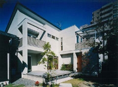 両親の敷地の一部に建てた住宅。南側の庭は共有し、新たに駐車場と門扉を作り、庭からアプローチするという形態になっている。