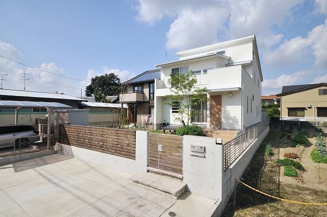 奥行きの深い敷地でオープンな駐車場とプライベートな庭をきっちり分けたシンプルな外観