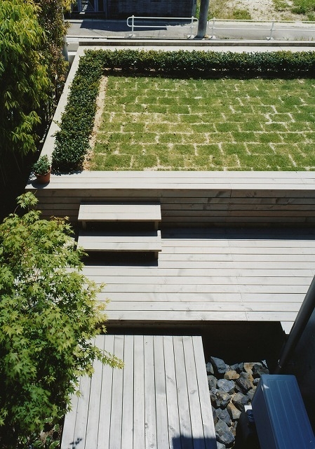 駐車場の屋上を緑化し、手前の寝室と一体化するように工夫した。駐車場のパラペットをベンチ代わりにするなど、高低差を外構の装置として生かしている。