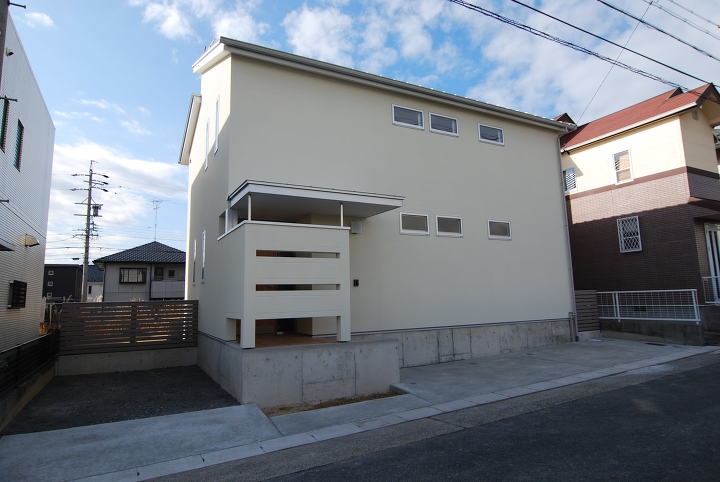 北道路に面しているのでおとなしい外観。玄関入口部分を取り囲んでアクセントにしている。